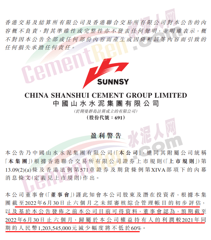 山水水泥7月17日公告,根據(jù)集團(tuán)截至2022年6月30日止六個月之未經(jīng)審核綜合管理帳目的初步評估,以及基于公告發(fā)布之前公司目前可得資料,董事會認(rèn)為,預(yù)期截至2022年6月30日止六個月,歸屬于公司權(quán)益持有人的利潤較2021年同期約12.04億元減少幅度將不低于60%。