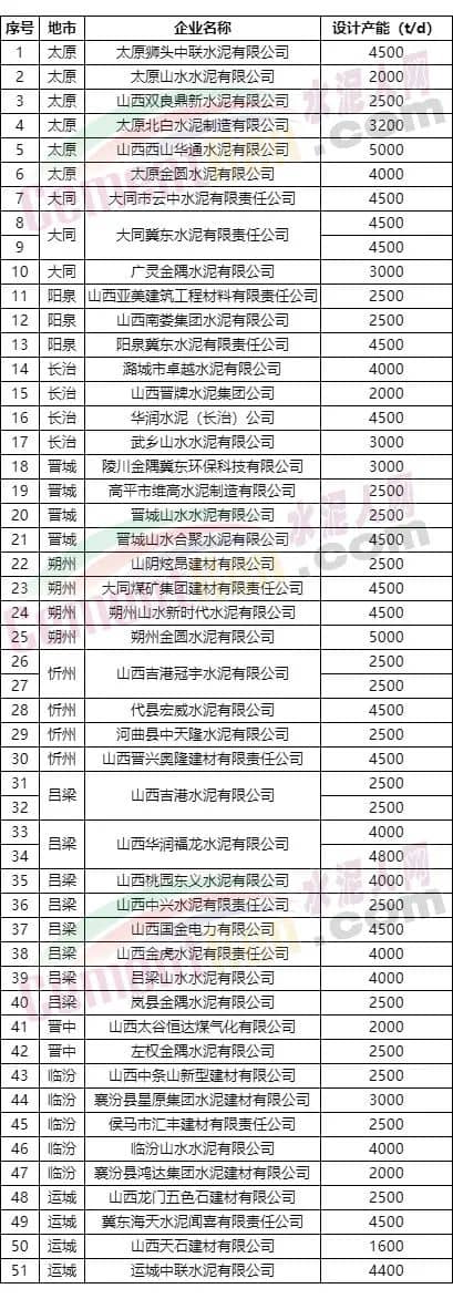 據(jù)山西省工信廳公布的熟料生產(chǎn)線清單顯示,山西省內包括中聯(lián)水泥、金隅冀東、山水水泥、金圓水泥旗下企業(yè)在內的熟料生產(chǎn)線共51條。