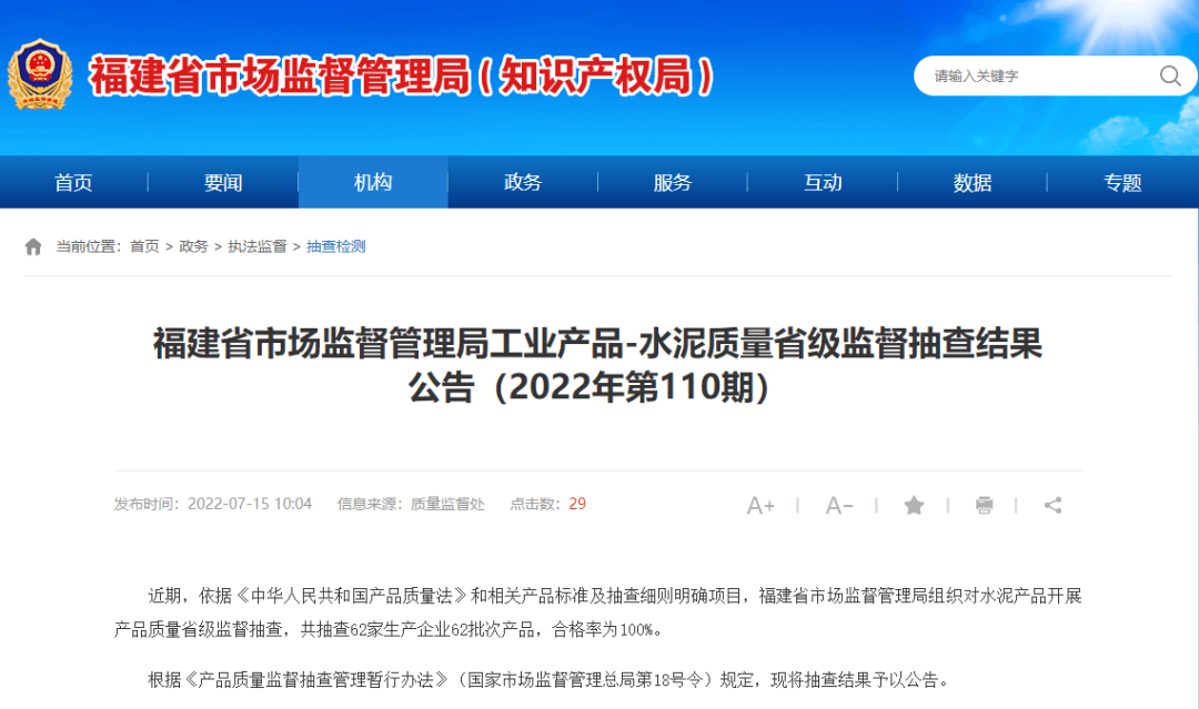 7月15日,福建省市場監(jiān)督管理局公布了《福建省市場監(jiān)督管理局工業(yè)產(chǎn)品-水泥質量省級監(jiān)督抽查結果公告(2022年第110期)》。