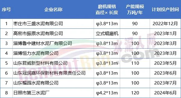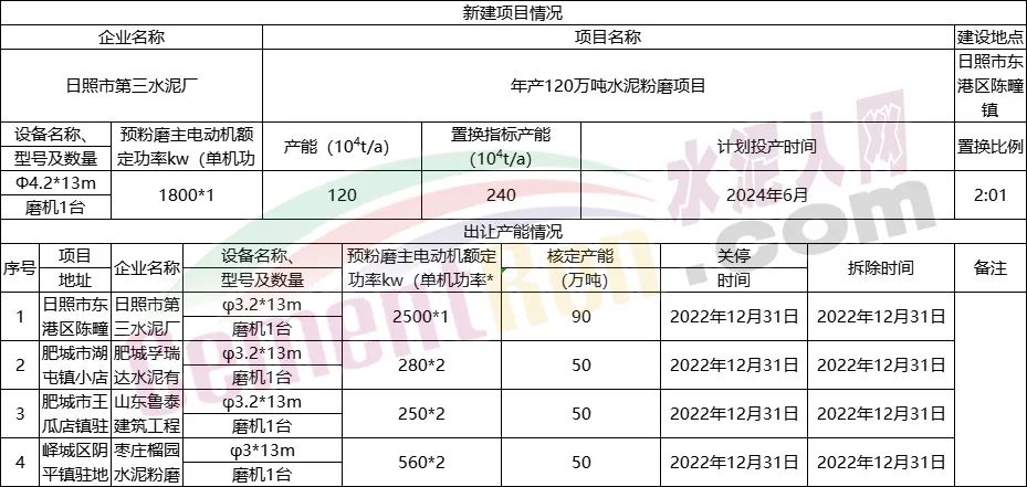 日前,山東省工信廳發(fā)布《關于8家企業(yè)新建水泥粉磨項目產(chǎn)能置換情況公示》稱,根據(jù)相關文件規(guī)定,8家企業(yè)制定了產(chǎn)能置換方案。置換比例全部為2:1,新建線產(chǎn)能規(guī)模為90~120萬噸/年,擬投產(chǎn)日期從2022年12月至2024年6月,合計產(chǎn)能達810萬噸/年,詳情如下: