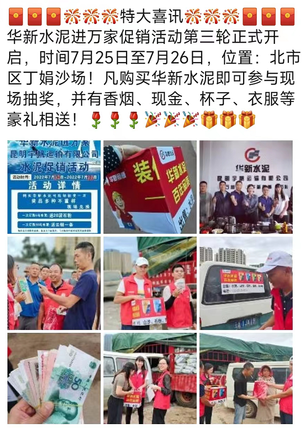 據(jù)市場(chǎng)反饋,近來云南昆明區(qū)域主要品牌企業(yè)發(fā)起了夏季促銷活動(dòng)。一次訂購5噸水泥,送20袋石粉,一次訂購10噸水泥,送云煙一條。