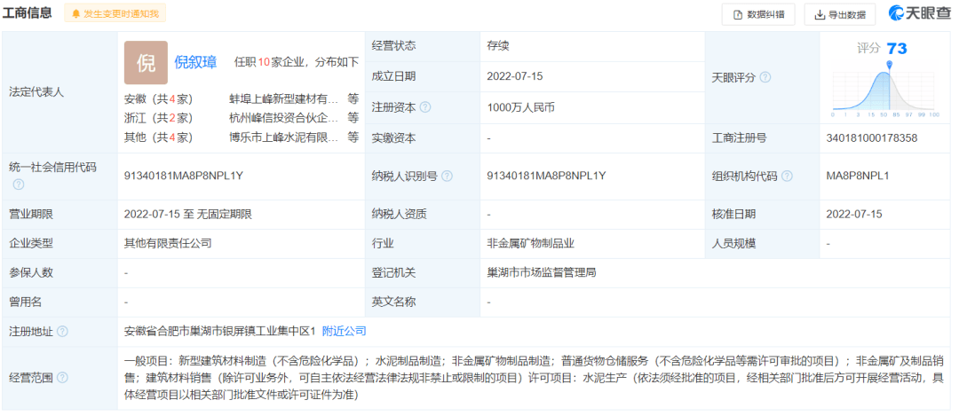 天眼查信息顯示,7月15日,巢湖上峰恒信新型材料有限公司成立,法人倪敘璋。企業(yè)注冊(cè)資本1000萬(wàn)元人民幣,經(jīng)營(yíng)范圍包含:一般項(xiàng)目:新型建筑材料制造(不含危險(xiǎn)化學(xué)品);水泥制品制造;非金屬礦物制品制造;普通貨物倉(cāng)儲(chǔ)服務(wù)(不含危險(xiǎn)化學(xué)品等需許可審批的項(xiàng)目);非金屬礦及制品銷(xiāo)售;建筑材料銷(xiāo)售(除許可業(yè)務(wù)外,可自主依法經(jīng)營(yíng)法律法規(guī)非禁止或限制的項(xiàng)目)許可項(xiàng)目:水泥生產(chǎn)(依法須經(jīng)批準(zhǔn)的項(xiàng)目,經(jīng)相關(guān)部門(mén)批準(zhǔn)后方可開(kāi)展經(jīng)營(yíng)活動(dòng),具體經(jīng)營(yíng)項(xiàng)目以相關(guān)部門(mén)批準(zhǔn)文件或許可證件為準(zhǔn))