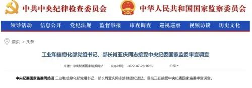 7月28日16時30分,據(jù)中央紀委國家監(jiān)委官網(wǎng)消息,工業(yè)和信息化部黨組書記、部長肖亞慶同志涉嫌違紀違法,目前正在接受中央紀委國家監(jiān)委審查調(diào)查。