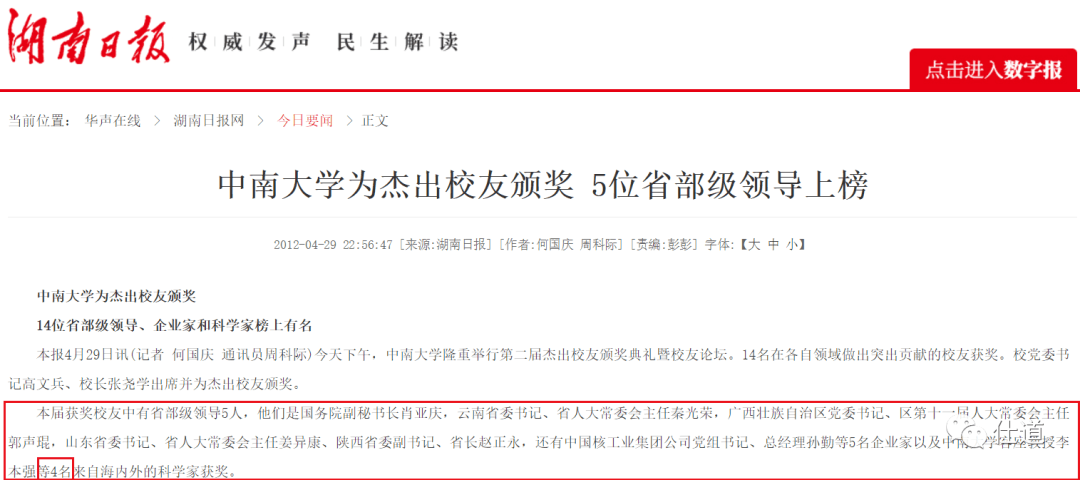 這屆中南大學的杰出校友評了14個,當時對此做報道的《湖南日報》特別指出,“本屆獲獎校友中有省部級領導5人”。
