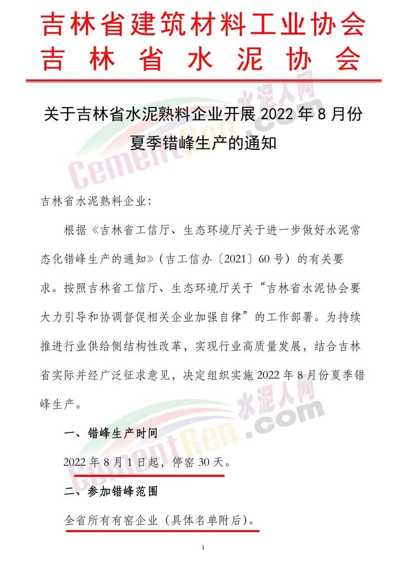 吉林省建筑材料工業(yè)協(xié)會吉林省水泥協(xié)會發(fā)布《關于吉林省水泥熟料企業(yè)開展2022年8月份夏季錯峰生產(chǎn)的通知)給吉林省水泥熟料企業(yè)要求實施2022年8月份夏季錯峰生產(chǎn)。