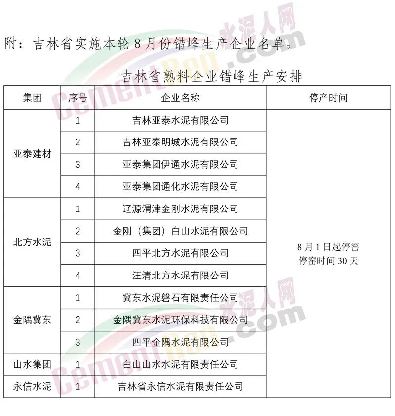 吉林省實施8月份錯峰生產(chǎn)企業(yè)名單中包括亞泰建材、北方水泥、金隅冀東、山水集團、永信水泥等5家企業(yè)。
