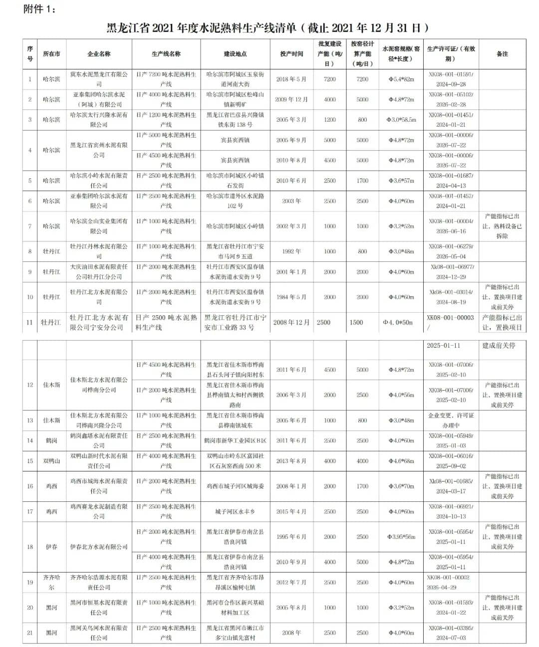 黑龍江工信廳近期發(fā)布的水泥熟料生產(chǎn)線清單可見,黑龍江省截止2021年12月31日21家熟料生產(chǎn)企業(yè)共有23線熟料生產(chǎn)線。