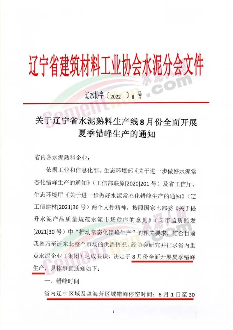 日前,遼寧省建筑材料工業(yè)協(xié)會水泥分會發(fā)布《關于遼寧省水泥熟料生產線8月份全面開展夏季錯峰生產的通知》給省內各水泥熟料企業(yè)稱,依據相關文件要求,結合目前遼寧省乃至泛東北整個市場的供需情況,經協(xié)會研究并征求省內重點