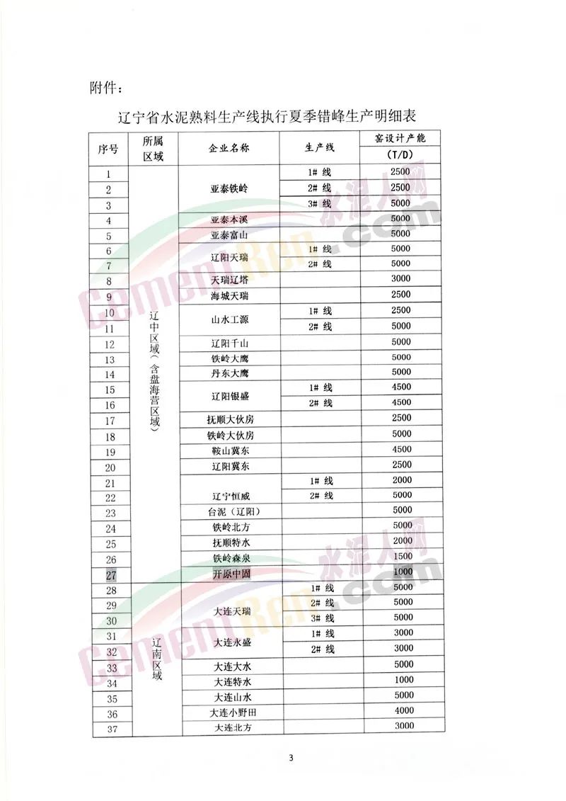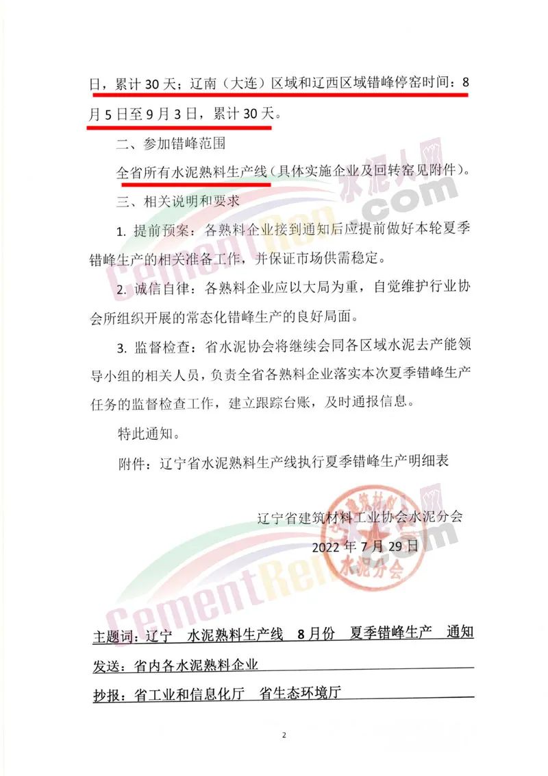 熟料生產線8月份全面開展夏季錯峰生產。遼中區(qū)域及盤海營區(qū)域錯峰停窯時間:8月1日至30日,累計30天;遼南(大連)區(qū)域和遼西區(qū)域錯峰停窯時間:8月5日至9月3日,累計30天。