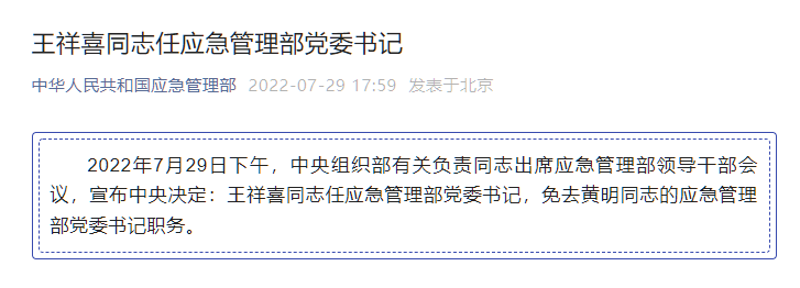 同日 ,應(yīng)急管理部官微消息:2022年7月29日下午, 中央組織部有關(guān)負責(zé)同志出席應(yīng)急管理部領(lǐng)導(dǎo)干部會議, 宣布中央決定:王祥喜同志任應(yīng)急管理部黨委書記,免去黃明同志的應(yīng)急管理部黨委書記職務(wù)。