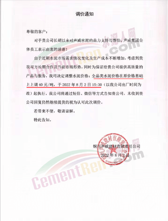 同日,銅川聲威建材有限責(zé)任公司通知自8月2日起上調(diào)全品類水泥價格40元/噸。