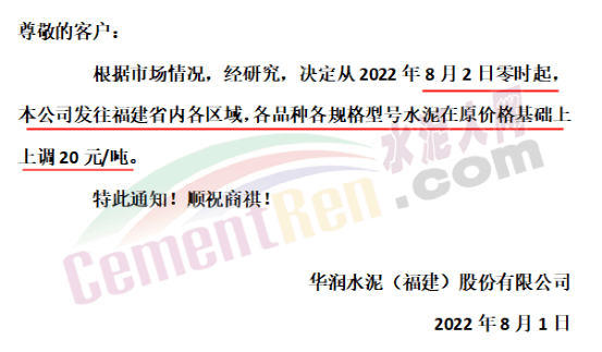 華潤水泥(福建)股份有限公司通知,從2022年8月2日零時起,上調(diào)水泥價格20元/噸。