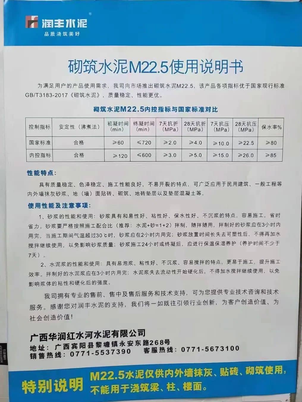 產(chǎn)品使用說明書中提到,為滿足用戶的產(chǎn)品使用需求,公司向市場(chǎng)推出砌筑水泥M22.5,該產(chǎn)品各項(xiàng)指標(biāo)優(yōu)于國家現(xiàn)行標(biāo)準(zhǔn) GB/T3183-2017《砌筑水泥》,質(zhì)量穩(wěn)定、性能更優(yōu)。并特別說明不能用于澆筑梁、柱、樓面。 M22.5水泥僅供內(nèi)外墻抹灰、貼磚、砌筑使用,