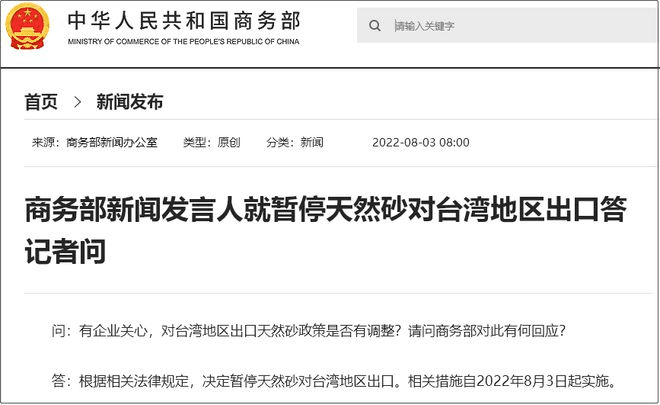 自佩洛西竄訪后,中國進行了雷霆反制。據商務部網站消息,商務部新聞發(fā)言人就暫停天然砂對臺灣地區(qū)出口答記者問。商務部新聞發(fā)言人表示,根據相關法律規(guī)定,決定暫停天然砂對臺灣地區(qū)出口,相關措施自2022年8月3日起實施。