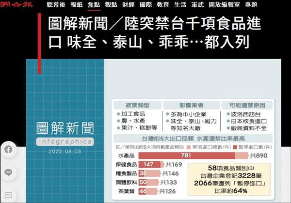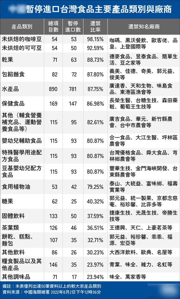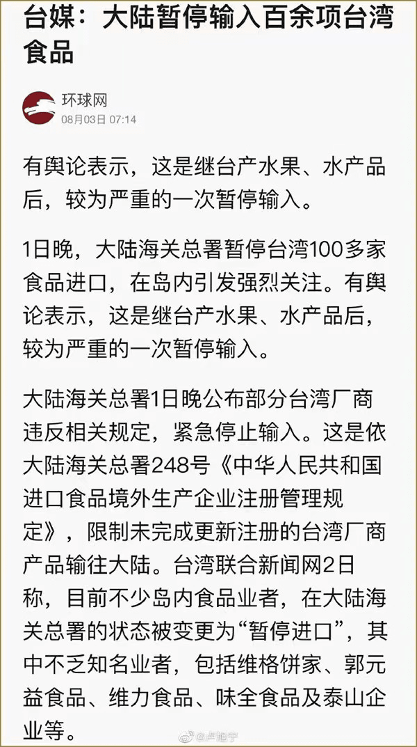 消息顯示,8月1日晚,海關總署就宣布暫停對中國臺灣地區(qū)的100多家食品進口,隨后清單又進一步擴大,自8月3日起暫停進口中國臺灣地區(qū)的檸檬、葡萄柚等柑橘類水果以及冰鮮白帶魚、凍竹莢魚等水產品。