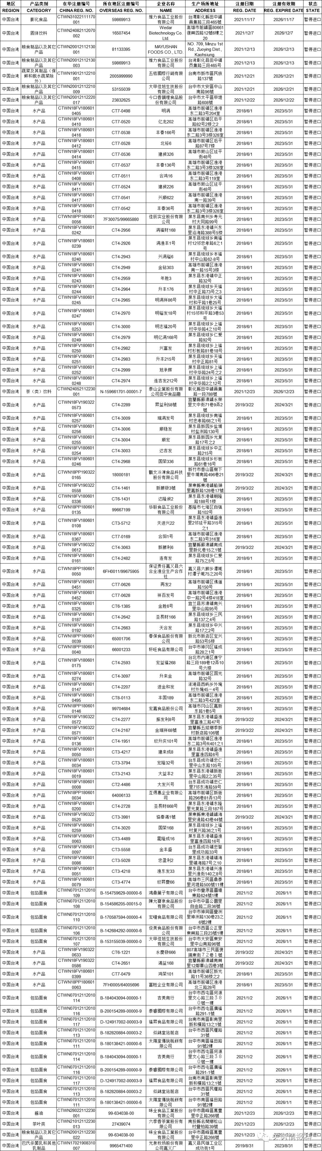 在海關總署官網港澳臺地區(qū)生產企業(yè)注冊信息頁面上查詢臺灣生產商資料,有部分企業(yè)的狀態(tài)欄已顯示“暫停進口”,其中包括維力食品、郭元益食品、味全食品、泰山、維格餅家等。據悉,這是依據海關總署第248號令《中華人民共和國進口食品境外生產企業(yè)注冊管理規(guī)定》,限制未完成更新注冊的臺灣廠商產品輸往大陸。