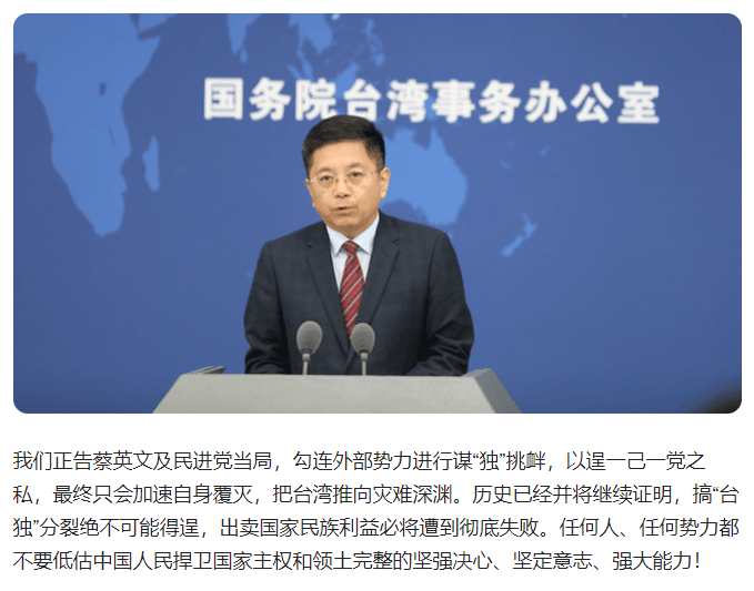 國臺辦表示,歷史已經并將繼續(xù)證明,搞“臺獨”分裂絕不可能得逞,出賣國家民族利益必將遭到徹底失敗。任何人、任何勢力都不要低估中國人民捍衛(wèi)國家主權和領土完整的堅強決心、堅定意志、強大能力!