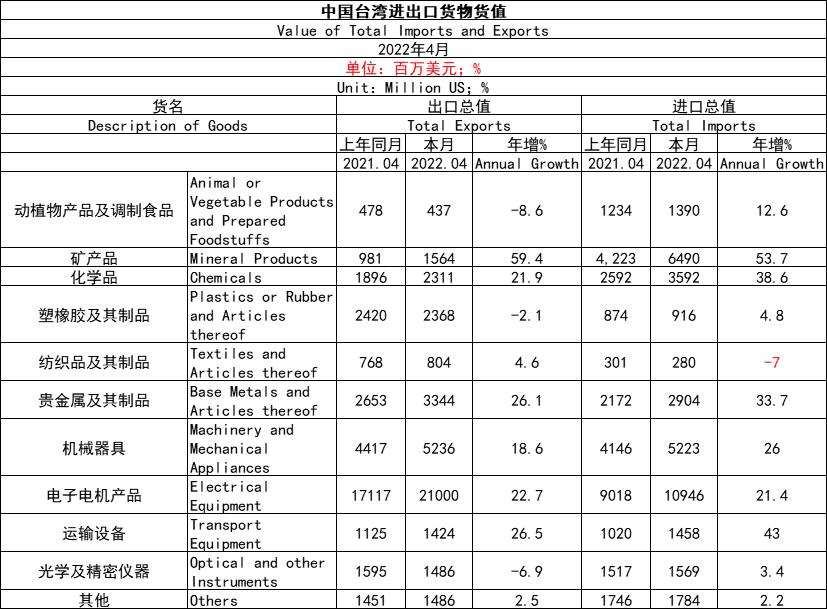 中國臺灣進出口產品涉及到礦產品、化學品、塑橡膠及其制品、紡織及其制品,以及電子、奠基、機械、運輸、精密儀器等。以今年4月數據來看,臺灣出口方面,電子電機產品當月出口總值為21000百萬美元,年增22.7%;礦產品、化學品塑橡膠及其制品、貴金屬及其制品、機械器具等出口總值較高。臺灣進口方面,電子電機產品當月進口總值為10946百萬美元,年增21.4%;礦產品、化學品等進口總值較高。