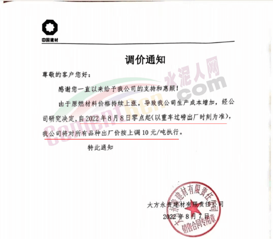 同期,大方永貴建材有限責(zé)任公司通知,自8月8日是零點(diǎn)起,對所有品牌出廠價按上調(diào)10元/噸執(zhí)行。