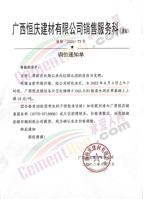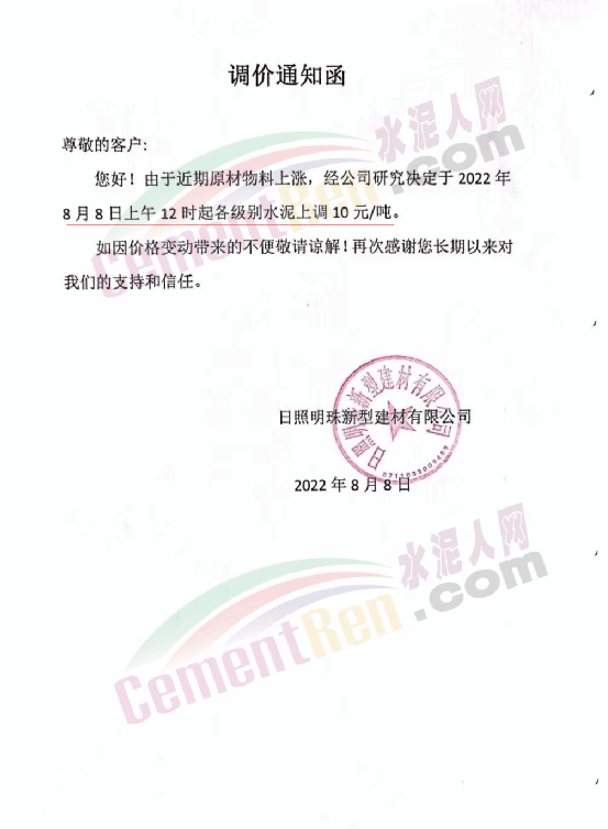 日照明珠新型建材有限公司通知,由于近期原材物料上漲,經(jīng)公司研究決定于8月月8日上午12時起各級別水泥上調(diào)10元/噸。