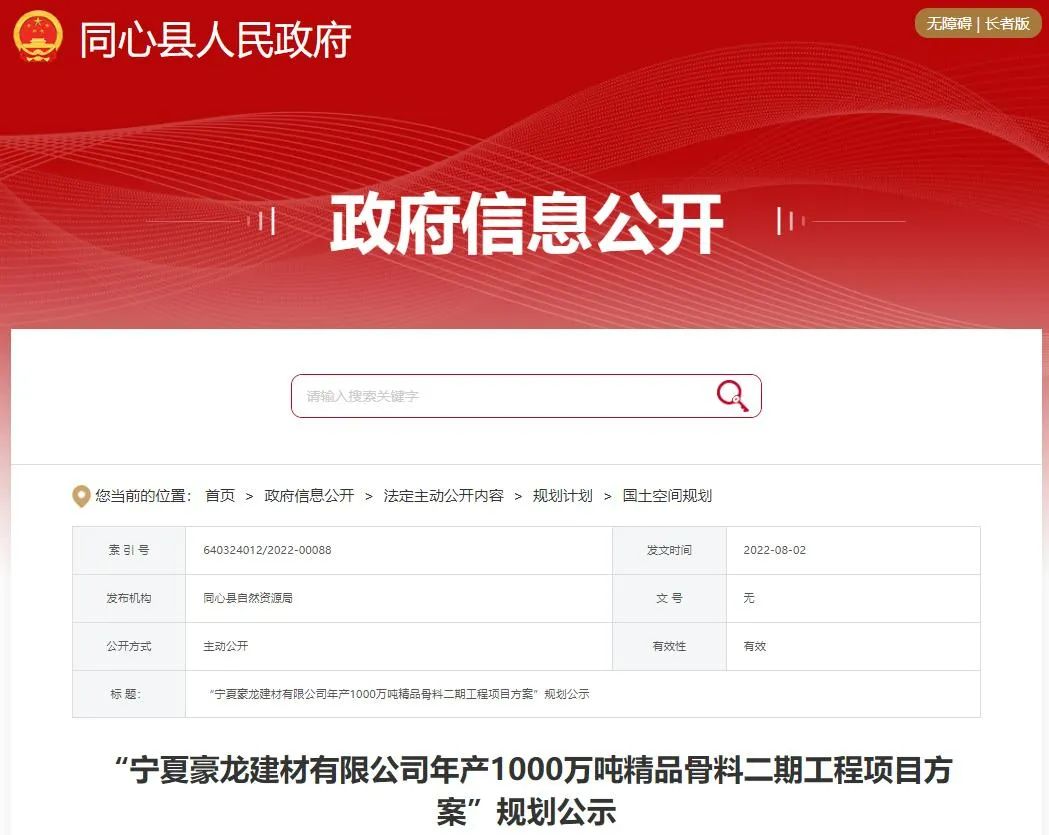 近日,同心縣自然資源局公示寧夏豪龍建材有限公司年產1000萬噸精品骨料二期工程項目方案規(guī)劃。