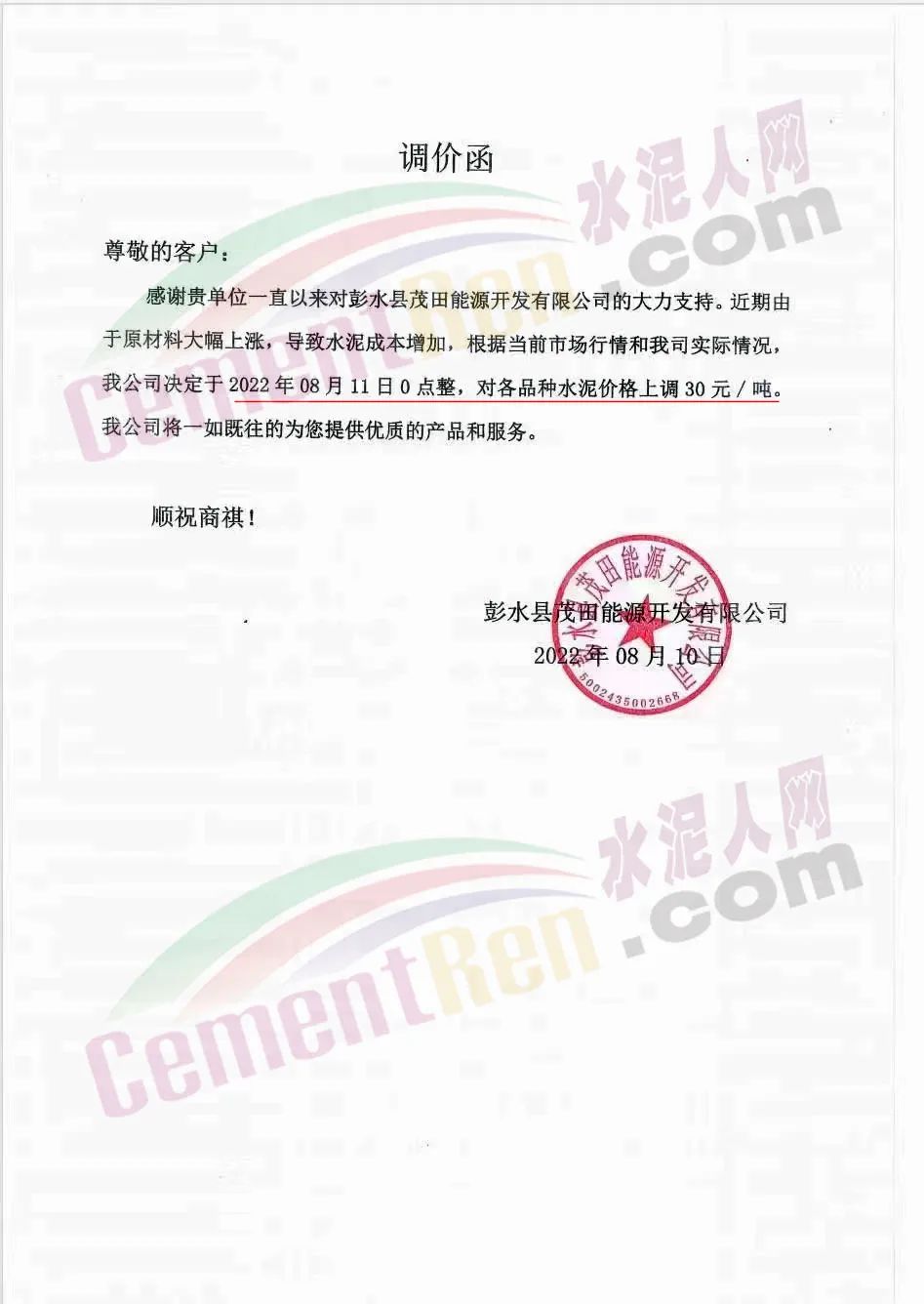 重慶彭水縣茂田能源開發(fā)有限公司調(diào)價(jià)函提到,由于原材料大幅上漲,導(dǎo)致水泥成本增加,根據(jù)當(dāng)前行情和公司實(shí)際情況,決定于8月11日0點(diǎn)整,對(duì)各品種水泥價(jià)格上調(diào)30元/噸。