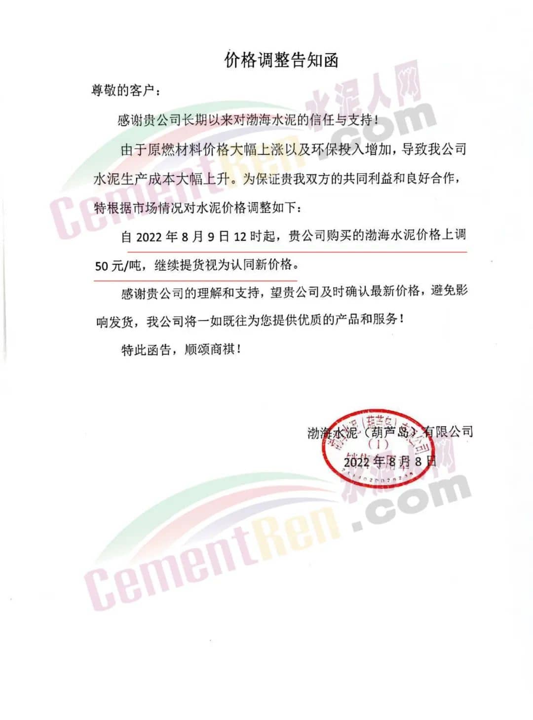渤海水泥(葫蘆島)有限公司價(jià)格調(diào)整告知函稱,由于原燃材料價(jià)格大幅上漲以及環(huán)保投入增加,導(dǎo)致公司水泥生產(chǎn)成本大幅上升,根據(jù)市場(chǎng)情況自8月9日12時(shí)起,渤海水泥價(jià)格上調(diào)50元/噸,繼續(xù)提貨視為認(rèn)同新價(jià)格。