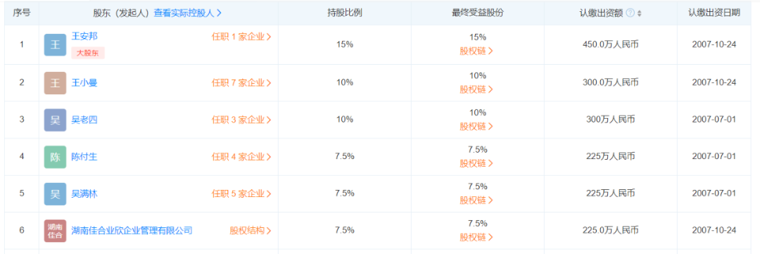 水泥人網(wǎng)注意到,企業(yè)現(xiàn)有股東中除湖南佳合業(yè)欣企業(yè)管理有限公司外其他12位均為自然人股東。前五大股東均為自然人。其中王安邦占股15%為大股東,王小曼、吳老四占股10%。