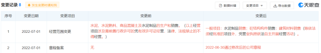 企業(yè)曾在7月1日發(fā)生變更,經(jīng)營(yíng)范圍由水泥、水泥熟料、商品混凝土及水泥制品的生產(chǎn)和銷售。變更為一般項(xiàng)目:水泥制品銷售;砼結(jié)構(gòu)構(gòu)件銷售;建筑材料銷售。