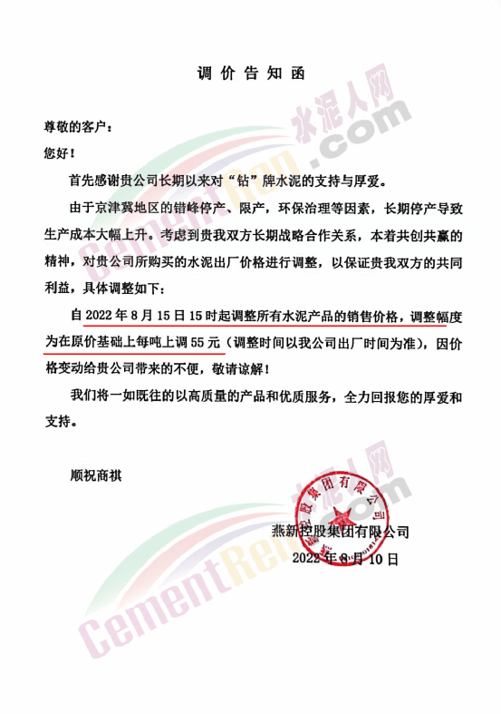 燕新控股集團(tuán)有限公司通知由于京津冀地區(qū)的錯(cuò)峰停產(chǎn)、限產(chǎn),環(huán)保治理等因素,長(zhǎng)期停產(chǎn)導(dǎo)致生產(chǎn)成本大幅上升。公司自2022年8月15日15時(shí)起所有水泥產(chǎn)品的銷售價(jià)格上調(diào)55元/噸。