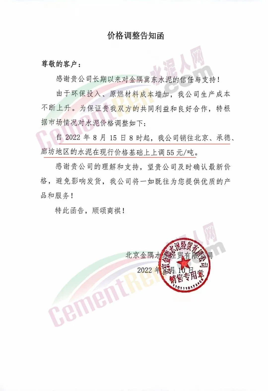 北京金隅水泥經(jīng)貿(mào)有限公司通知由于環(huán)保投入,原燃材料成本增加,公司生產(chǎn)成本不斷上升。8月15日8時(shí)起,公司銷往北京、承德、廊坊地區(qū)的水泥在現(xiàn)行價(jià)格基礎(chǔ)上上調(diào)55元/噸。