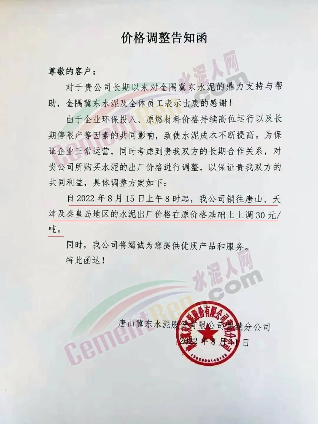 唐山冀東水泥通知,由于企業(yè)環(huán)保投入,原材料價(jià)格持續(xù)高位運(yùn)行以及長(zhǎng)期停限產(chǎn)等因素的共同影響,致使水泥成本不斷提高。自8月15日上午8時(shí)起,公司銷往唐山、天津及秦皇島地區(qū)的水泥出廠價(jià)格在原價(jià)基礎(chǔ)上上調(diào)30元/噸。