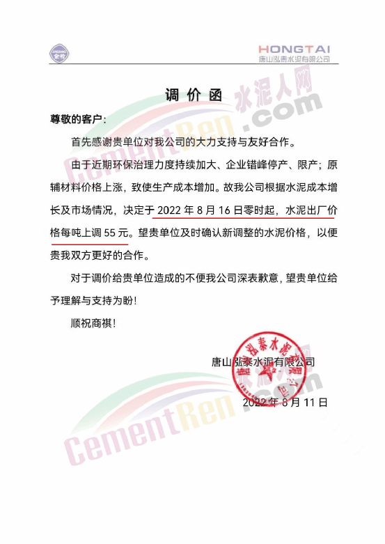 唐山泓泰水泥有限公司通知,由于近期環(huán)保治理力度持續(xù)加大,企業(yè)錯(cuò)峰停產(chǎn)、限產(chǎn);原輔材料價(jià)格上漲,致使生產(chǎn)成本增加。公司根據(jù)水泥成本增長(zhǎng)及市場(chǎng)情況,決定于8月16日零時(shí)起,水泥出廠價(jià)格上調(diào)55元/噸。