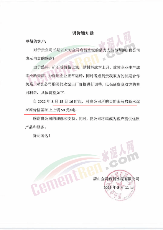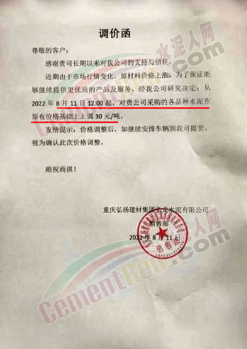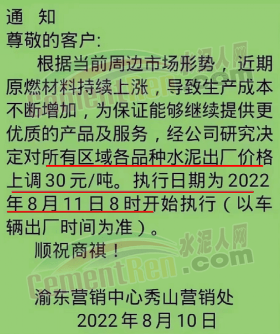 渝東營(yíng)銷中心秀山營(yíng)銷處通知,根據(jù)當(dāng)前周邊市場(chǎng)形勢(shì),近期原燃材料持續(xù)上漲,導(dǎo)致生產(chǎn)成本不斷增加,為保證能夠繼續(xù)提供更優(yōu)質(zhì)的產(chǎn)品及服務(wù),經(jīng)公司研究決定對(duì)所有區(qū)域各品種水泥出廠價(jià)格上調(diào)30元/噸,執(zhí)行日期為2022年8月11日8時(shí)。