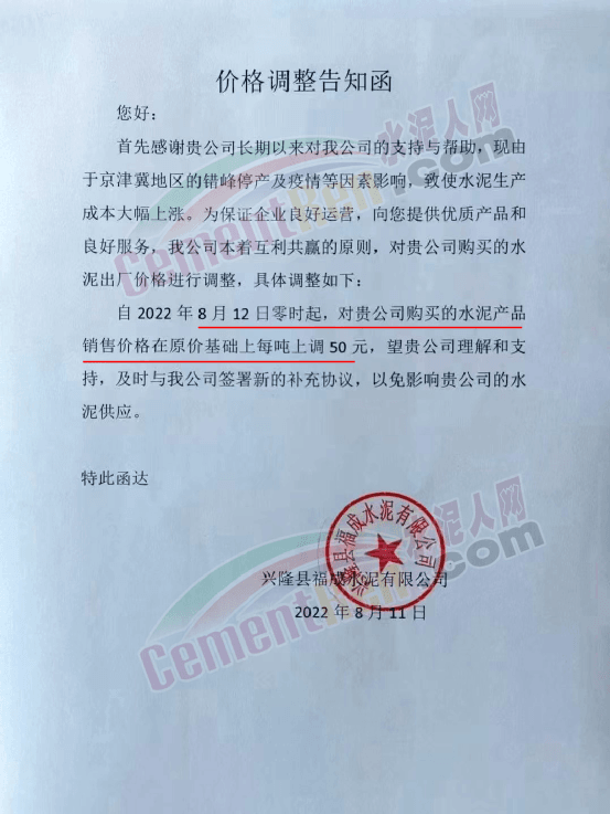 興隆縣福成水泥有限公司通知,由于京津冀地區(qū)的錯(cuò)峰停產(chǎn)及疫情等因素影響,致使水泥生產(chǎn)成本大幅上漲。公司水泥出廠價(jià)格自8月12日零時(shí)起上調(diào)50元/噸。