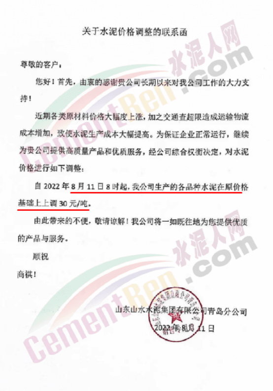 同期,山東山水水泥集團(tuán)有限公司青島分公司通知,近期各類原材料價(jià)格大幅度上漲,加之交通查超限造成運(yùn)輸物流成本增加,致使水泥生產(chǎn)成本大幅提高。經(jīng)公司綜合權(quán)衡決定,自8月11日8時(shí)起,對(duì)公司生產(chǎn)的各品種水泥在原價(jià)基礎(chǔ)上上調(diào)30元/噸。