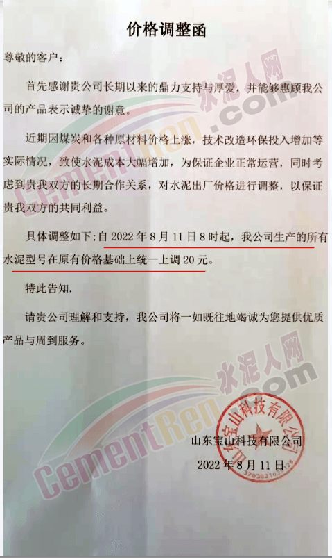 山東寶山科技有限公司通知,因煤炭和各種原材料價(jià)格上漲,技術(shù)改造環(huán)保投入增加等實(shí)際情況,致使水泥成本大幅增加,為保證企業(yè)正常運(yùn)營(yíng),自8月11日8時(shí)起,公司生產(chǎn)的所有水泥型號(hào)在原價(jià)基礎(chǔ)上統(tǒng)一上調(diào)20元/噸。