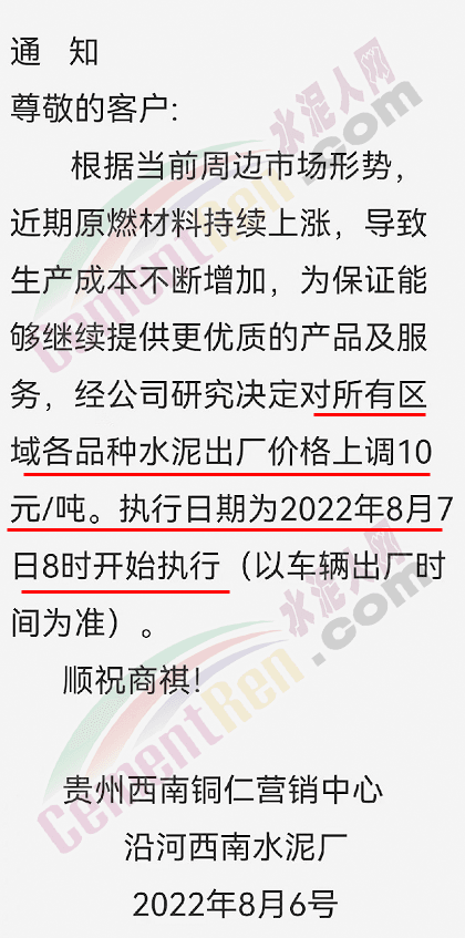 貴州西南銅仁營(yíng)銷中心沿河西南水泥廠通知根據(jù)當(dāng)前周邊市場(chǎng)形勢(shì),近期原燃材料持續(xù)上漲,導(dǎo)致生產(chǎn)成本不斷增加,為保證能夠繼續(xù)提供更優(yōu)質(zhì)的產(chǎn)品及服務(wù),經(jīng)公司研究決定對(duì)所有區(qū)域各品種水泥出廠價(jià)格上調(diào)10 元/噸,執(zhí)行日期為2022年8月7日8時(shí)。
