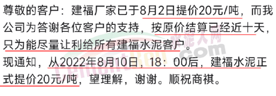 值得一提的是,福建水泥下屬工廠通知客戶稱,建福廠家已于8月2日提價(jià)20元/噸,而公司為答謝各位客戶的支持,按原價(jià)結(jié)算已經(jīng)近十天,只為能盡量讓利給所有建福水泥客戶。現(xiàn)通知,從2022年8月10日,18時(shí)后,建福水泥正式提價(jià)20元/噸。