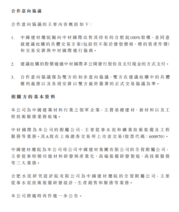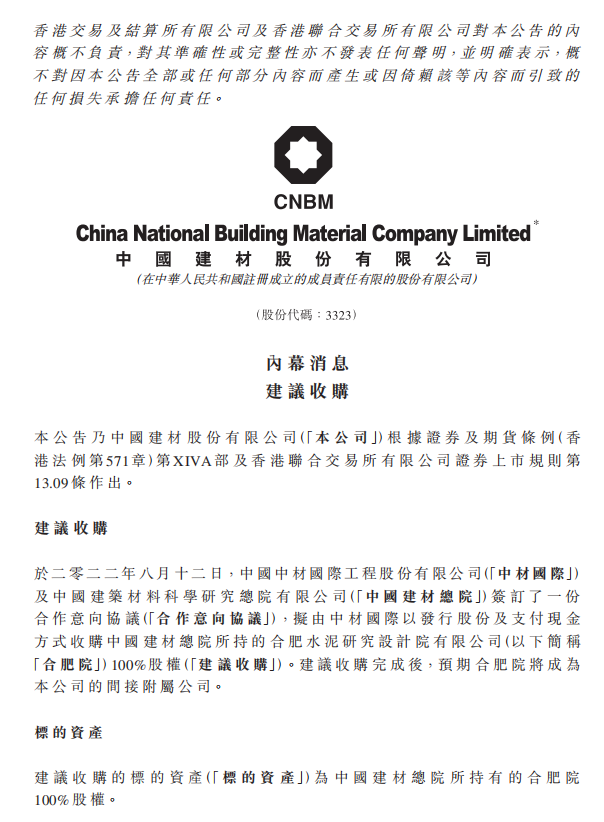 中國(guó)建材上市公司發(fā)布公告稱,于2022年8月12日,中國(guó)中材國(guó)際工程股份有限公司(「中材國(guó)際」)及中國(guó)建筑材料科學(xué)研究總院有限公司(「中國(guó)建材總院」)簽訂了一份合作意向協(xié)議(「合作意向協(xié)議」),擬由中材國(guó)際以發(fā)行股份及支付現(xiàn)金方式收購(gòu)中國(guó)建材總院所持的合肥水泥研究設(shè)計(jì)院有限公司(以下簡(jiǎn)稱「合肥院」)100%股權(quán)(「建議收購(gòu)」)。建議收購(gòu)?fù)瓿珊?,預(yù)期合肥院將成為本公司的間接附屬公司。