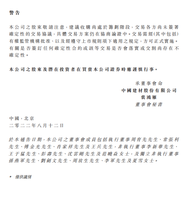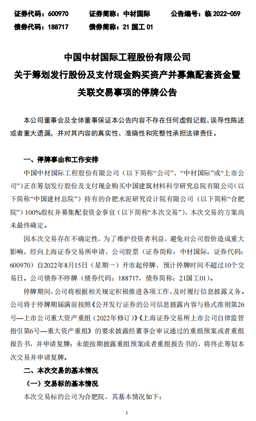 中材國(guó)際表示,本次交易存在不確定性,為維護(hù)投資者利益,避免對(duì)公司股價(jià)造成重大影響,公司股票自8月15日(星期一)開(kāi)市起停牌,預(yù)計(jì)停牌時(shí)間不超過(guò)10個(gè)交易日。