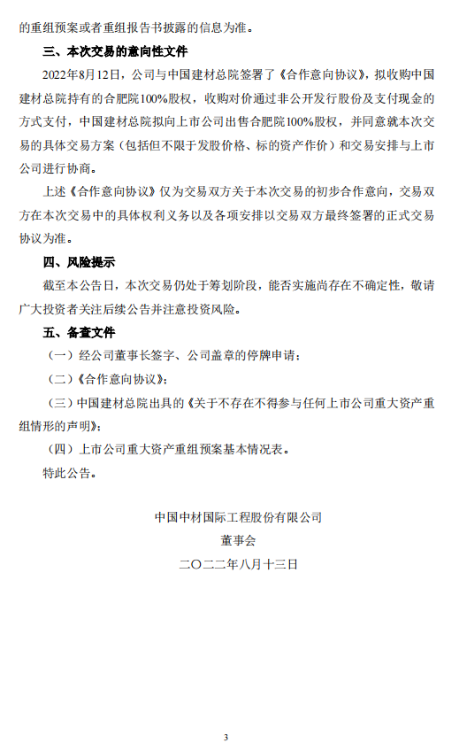 1.中國(guó)建材總院擬向中材國(guó)際出售其持有的合肥院100%股權(quán),并同意就建議收購(gòu)的具體交易方案(包括但不限于發(fā)股價(jià)格、標(biāo)的資產(chǎn)作價(jià))和交易安排與中材國(guó)際進(jìn)行協(xié)商。