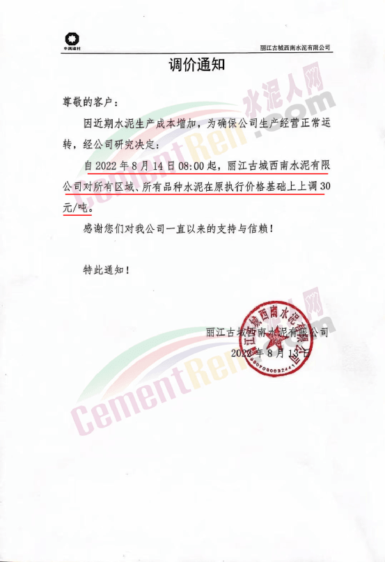華新水泥(劍川)有限公司通知,因生產(chǎn)成本增加,經(jīng)公司研究決定自8月14日8時起,所有水泥品種統(tǒng)一上調(diào)30元/噸。