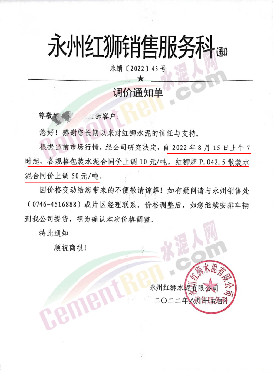 水泥人網(wǎng)注意到,湖南永州紅獅水泥銷售服務(wù)科通知根據(jù)當前市場行情,經(jīng)公司研究決定,自2022年8月15日上午7時起,各規(guī)格包裝水泥合同價上調(diào)10元/噸,紅獅牌P.042.5散裝水泥合同價上調(diào)50元/噸。價格調(diào)整后,如繼續(xù)安排車輛到公司提貨,視為確認本次價格調(diào)整。