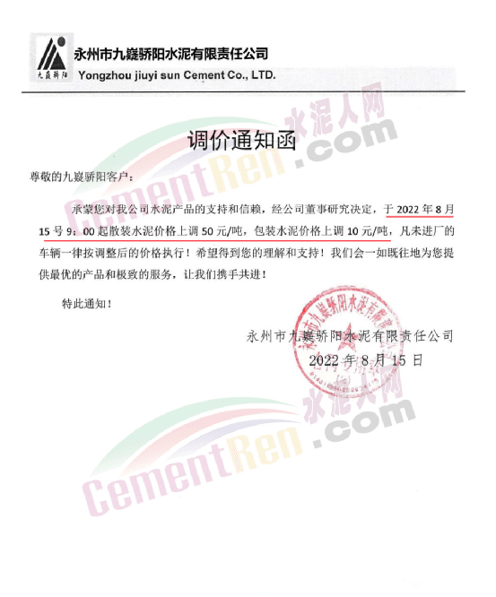 永州市九嶷驕陽水泥有限責(zé)任公司通知于2022年8月15號9∶00起散裝水泥價格上調(diào)50元/噸,包裝水泥價格上調(diào)10元/噸,凡未進廠的車輛一律按調(diào)整后的價格執(zhí)行!