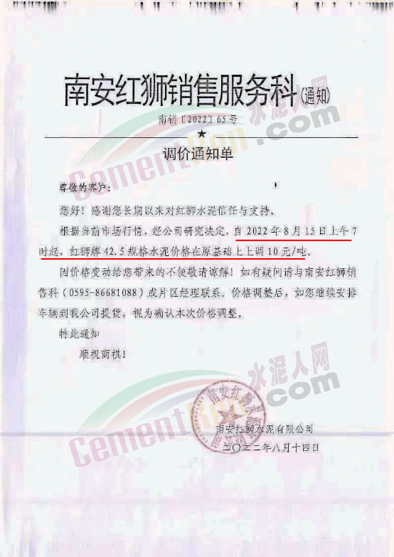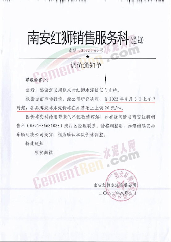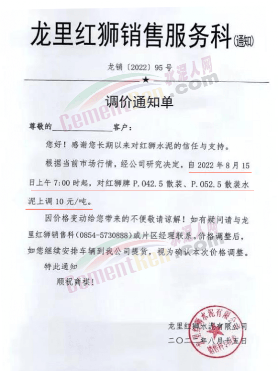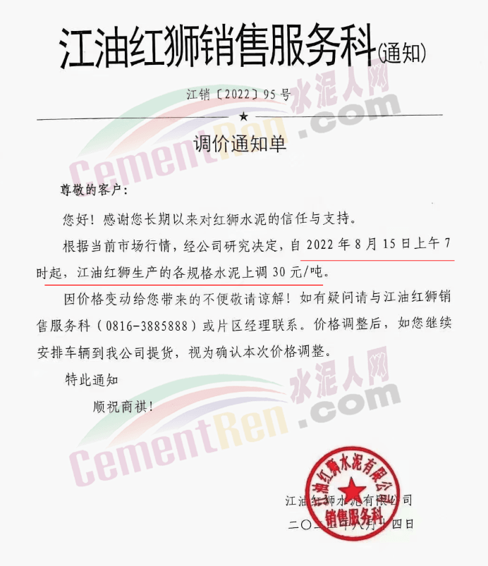 江油紅獅銷售服務(wù)科通知,根據(jù)當前市場行情,經(jīng)公司研究決定,自2022年8月15日上午7時起,江油紅獅生產(chǎn)的各規(guī)格水泥上調(diào)30元/噸。價格調(diào)整后,如您繼續(xù)安排車輛到我公司提貨,視為確認本次價格調(diào)整。