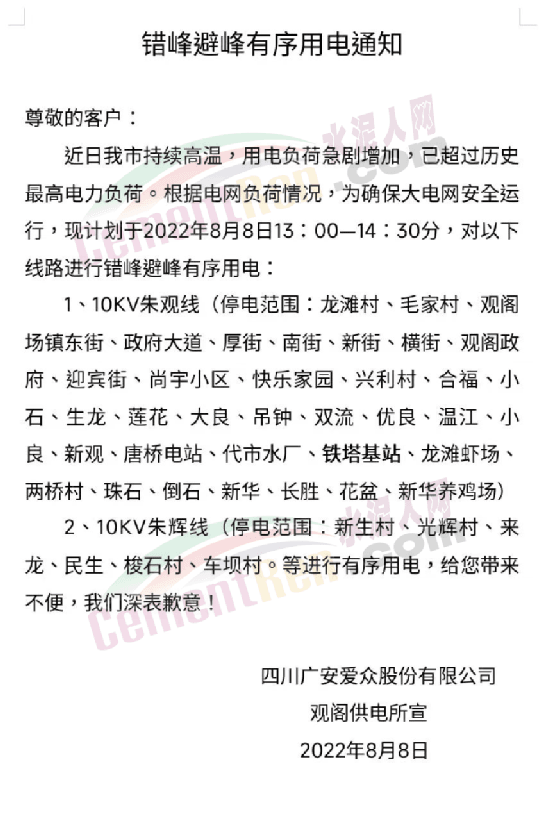 四川廣安愛眾股份有限公司觀閣供電所發(fā)布《錯峰避峰有序用電通知》給客戶稱,近日廣安市持續(xù)高溫,用電負荷急劇增加,已超過歷史最高電力負荷。根據(jù)電網(wǎng)負荷情況,為確保大電網(wǎng)安全運行,現(xiàn)計劃于2022年8月8日13∶00-14∶30分,對部分線路進行錯峰避峰有序用電,另一部分進行有序用電。
