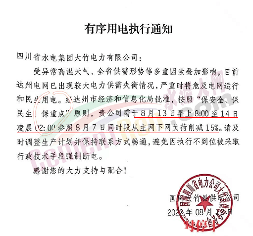 四川省水電集團大竹電力有限公司發(fā)布《有序用電執(zhí)行通知》稱,受異常高溫天氣、全省供需形勢等多重因素疊加影響,目前達州電網(wǎng)已出現(xiàn)較大電力供需失衡情況,嚴重時將危及電網(wǎng)運行和民生用電。經(jīng)達州市經(jīng)濟和信息化局批準,按照“保安全、保民生(保重點”原則,貴公司需于8月13日早上8∶00至14日凌晨2∶00參照8月7日同時段從主網(wǎng)下網(wǎng)負荷削減15%。請及時調(diào)整生產(chǎn)計劃并保持聯(lián)系方式暢通,避免因執(zhí)行不到位被采取行政技術(shù)手段強制斷電。