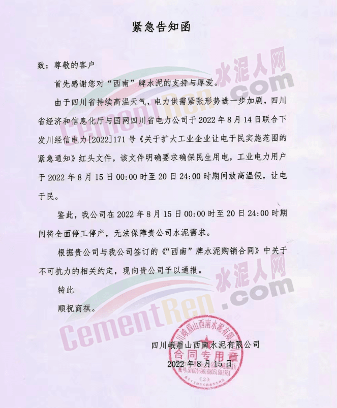 鑒此,公司在2022年8月15日0:00至20日24:00時期間將全面停產(chǎn),無法保障客戶正常水泥使用需求。根據(jù)貴我雙方簽訂的《水泥購銷合同》中關(guān)于不可抗力的相關(guān)約定,現(xiàn)向客戶予以通報。