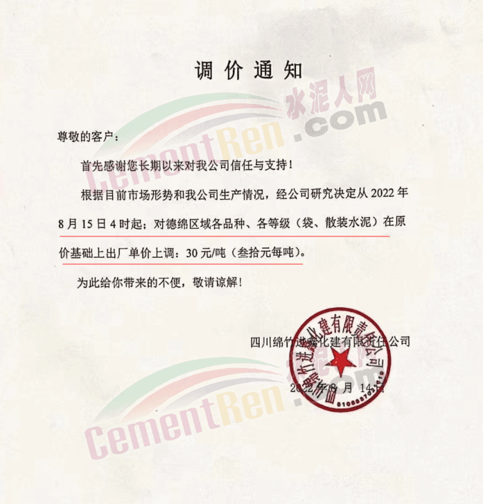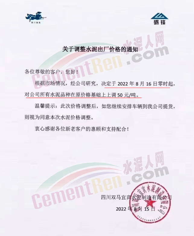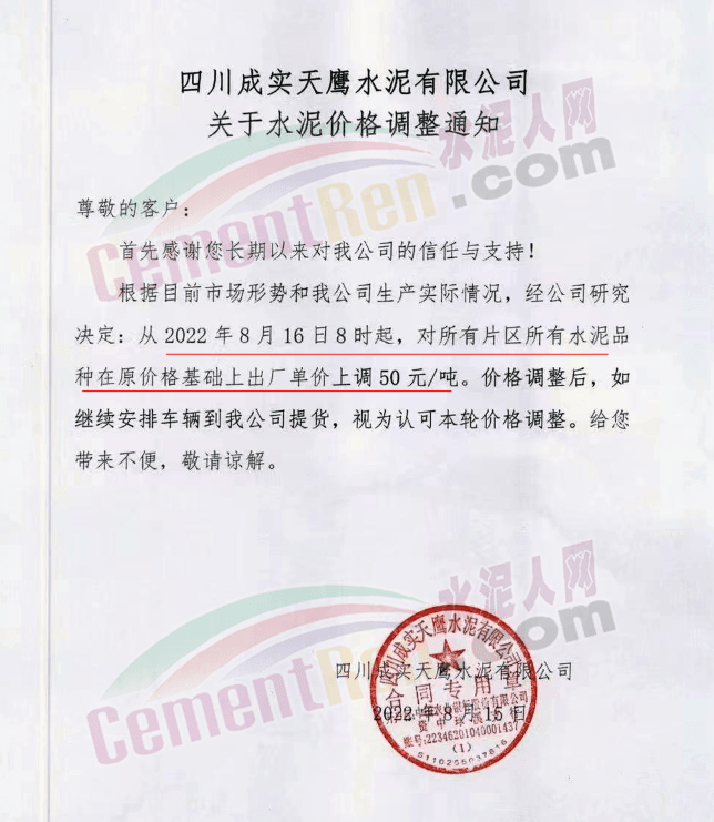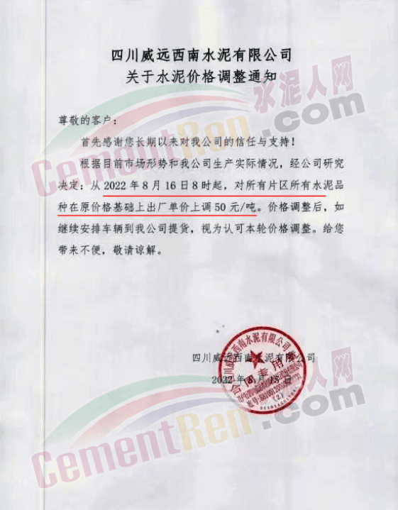 四川威遠西南水泥有限公司通知,根據(jù)目前市場形勢和我公司生產(chǎn)實際情況,經(jīng)公司研究決定,從2022年8月16日8時起,對所有片區(qū)所有水泥品種在原價格基礎(chǔ)上出廠單價上調(diào)50元/噸。價格調(diào)整后,如繼續(xù)安排車輛到我公司提貨,視為認可本輪價格調(diào)整。